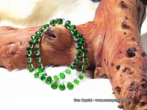 圖上的綠色半寶石,我一直認為是鉻電氣石,因為是跟熟識的廠商拿的,他蠻值得信任的,上周看到朋友說她有一串很透的透輝石條珠,但是市面上都當成鉻電氣石賣,我一看就想到這串,趕快把文章跟照片刪除,免得讓更多人誤會,一回家趕快拿查爾斯濾色鏡去看,果然沒有呈現鉻電氣石應有的紅色,過幾天拿去請寶石進口商看,果然是透輝石。